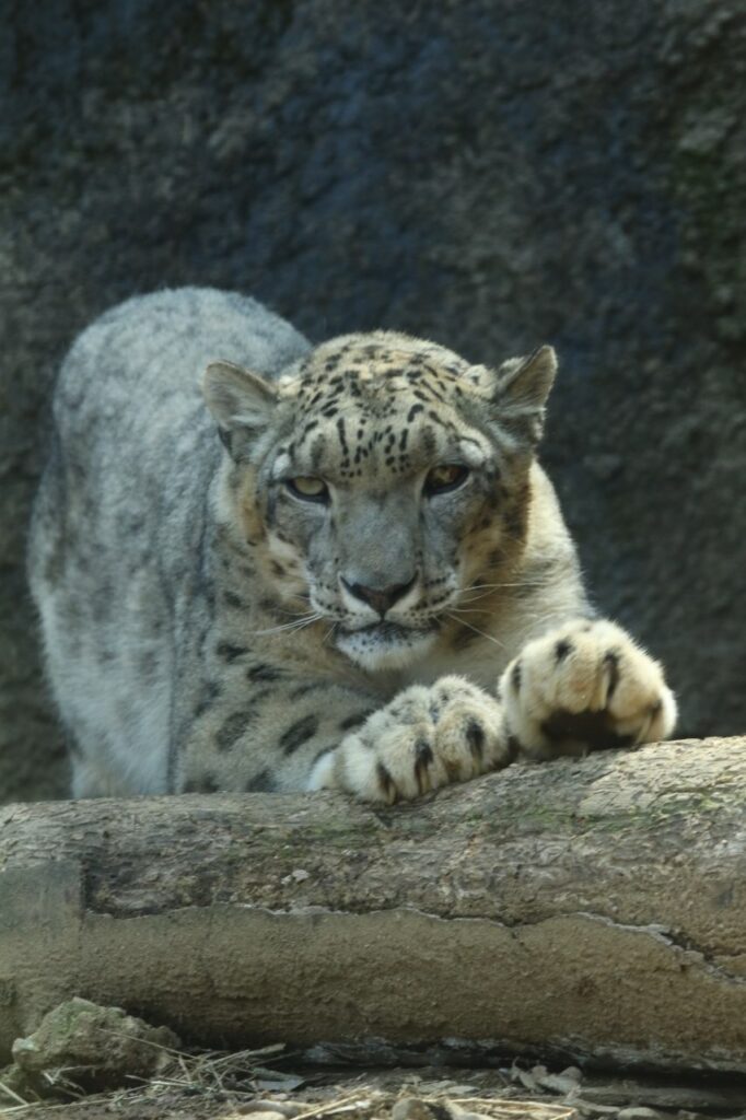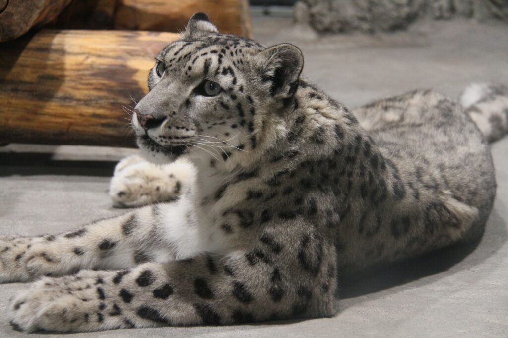 Resting quietly, the snow leopard conserves energy in a controlled environment.