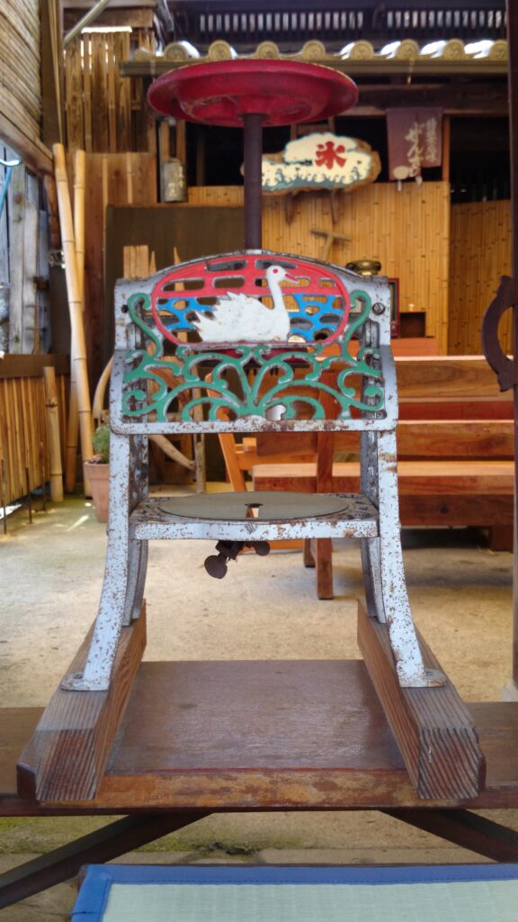 An old shaved ice machine, still in use after many summers.