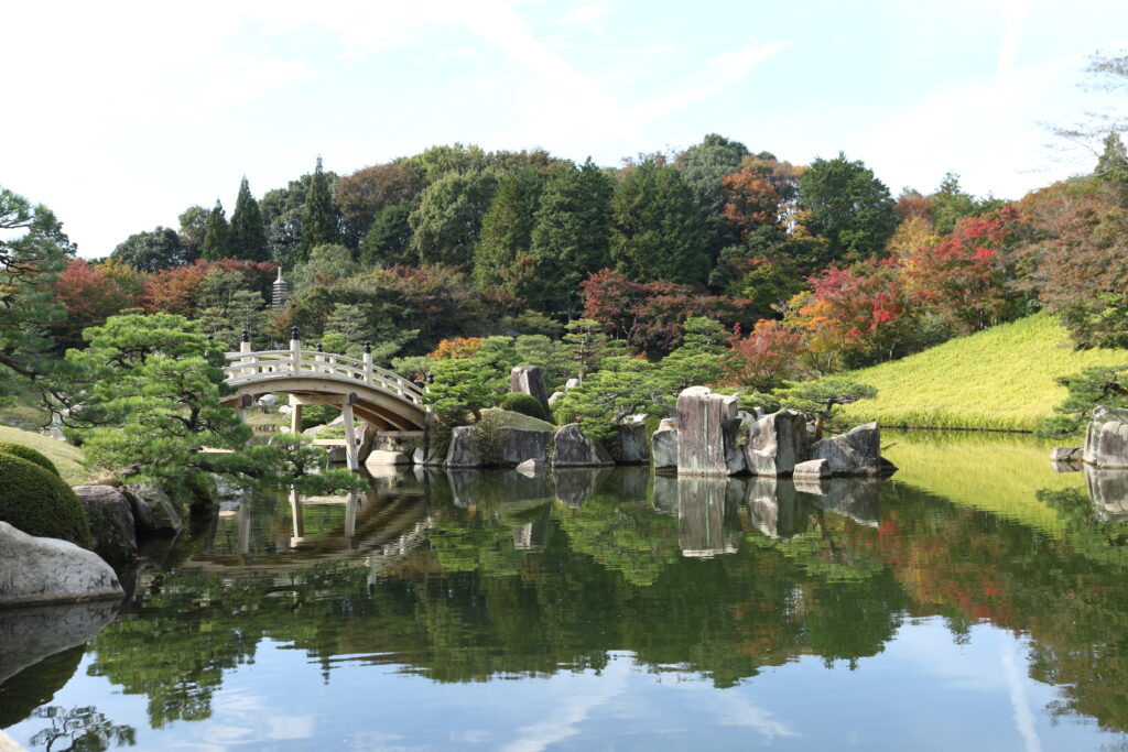 The garden features a harmonious landscape of ponds, stone arrangements, arched bridges, waterfalls, and carefully maintained pine trees. Its compact layout makes it easy to explore, yet each area presents a distinct seasonal view—true to its name, which means “Garden of Three Scenic Views.”