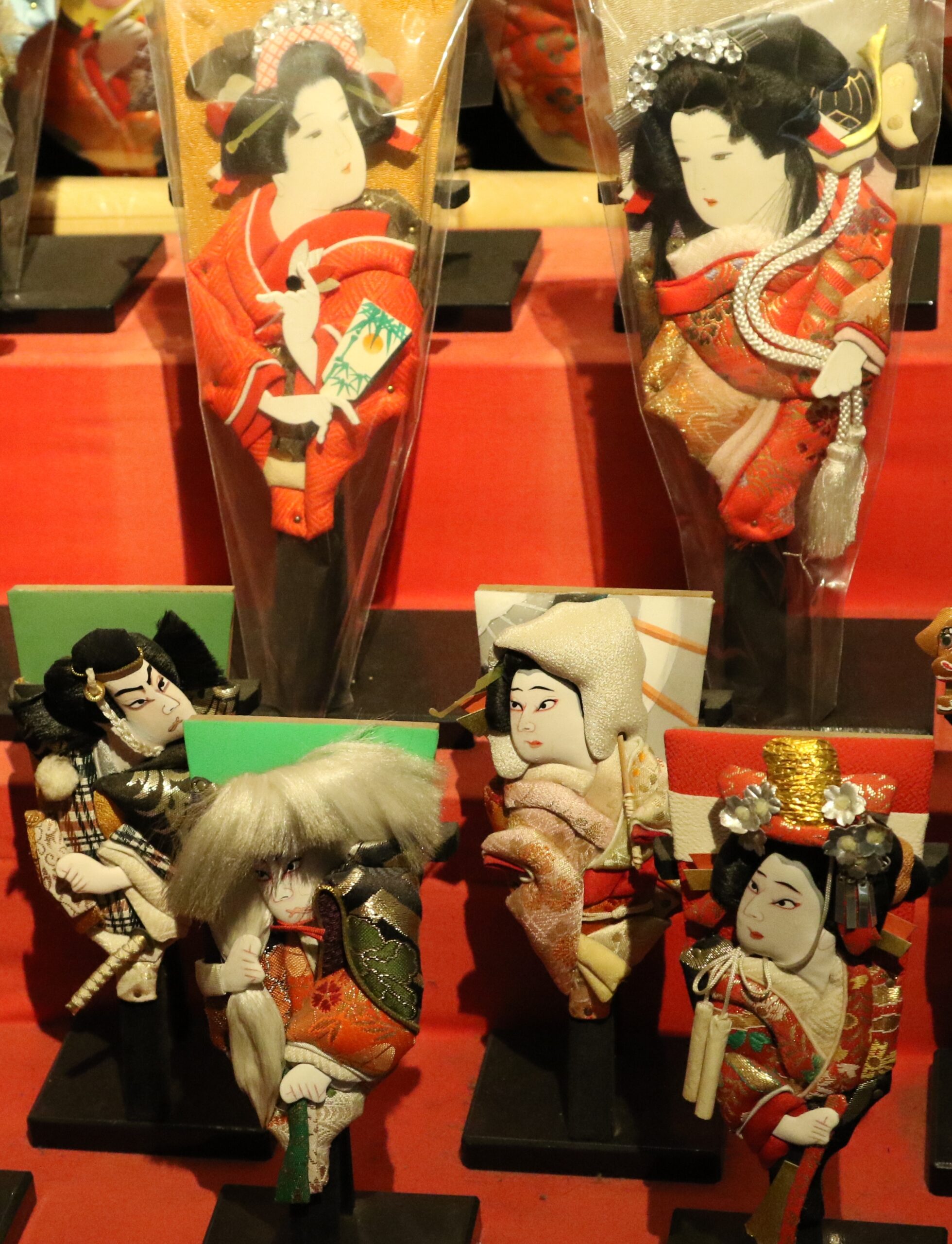 A display of decorative hagoita, showcasing the variety of styles inspired by kabuki and classical beauty.